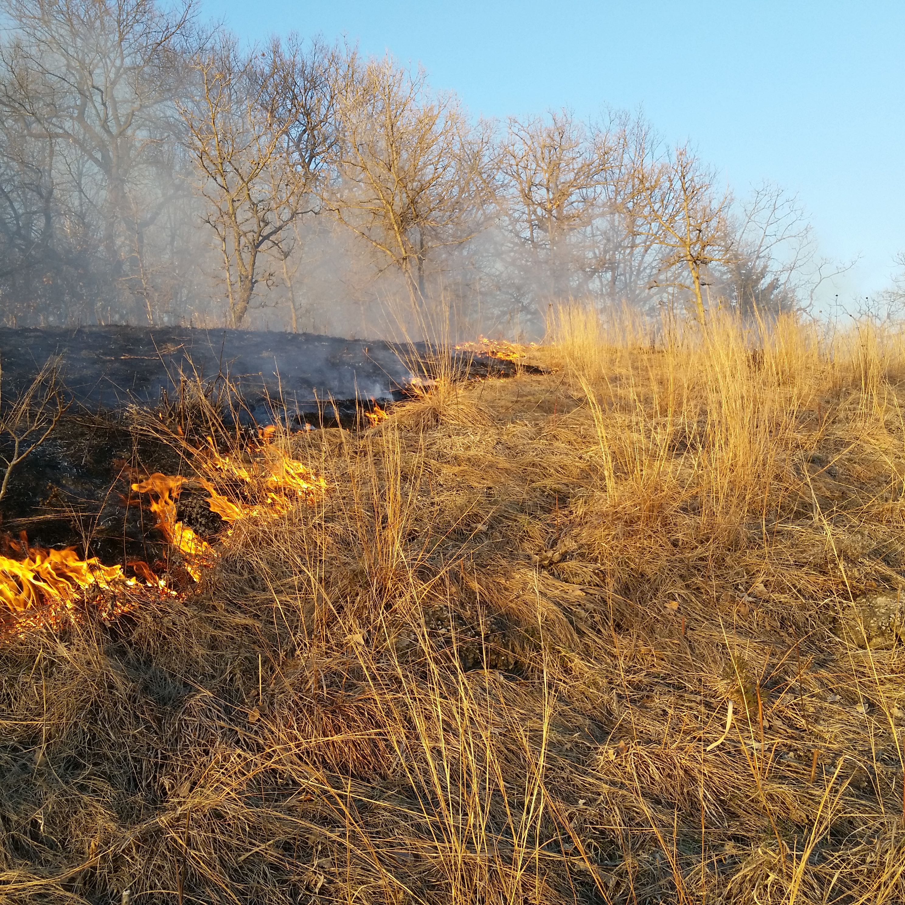 An April 2016 prescribed burn inches across the bluff prairie at River Oaks Park. Photo by Minnesota Native Landscapes