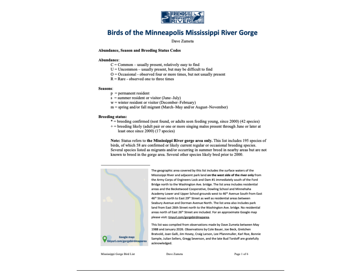 For the past few decades, Dave Zumeta, Minnesota Forest Resources Council's former executive director, has been birding the Minneapolis River Gorge. Dave has provided FMR with an extensive list of species observations — complete with data about abundance and breeding status — to help us track the avian species using the river gorge habitat.