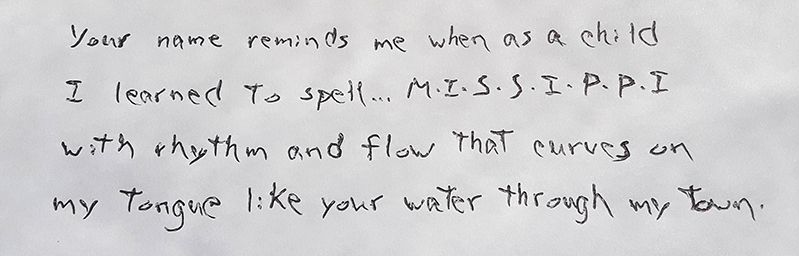 Local artist Susan Armington wove these love letters into a large painting called "Dreamsongs: the Mississippi Within Us" for our fall gala, excerpted above. The full painting, which you can see at the bottom of this page, now hangs in FMR's office.